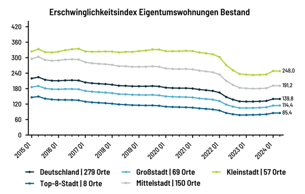 Nach einer längeren Phase sinkender Werte zeigt der IVD-Erschwinglichkeitsindex erste positive Signale: Die Erschwinglichkeit von Immobilien hat sich seit Ende 2023 wieder leicht verbessert. Es scheint, als sei die Talsohle erreicht und Käufer können auf eine Stabilisierung der finanziellen Belastung hoffen. Trotzdem bleibt das Niveau im Vergleich zu früheren Jahren deutlich niedriger.